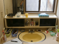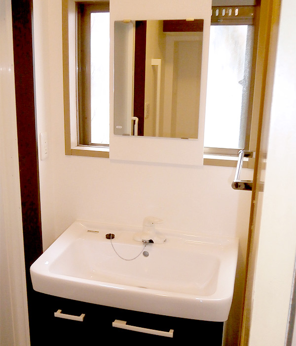 新しい化粧台。窓が干渉し、ミラーキャビネットをつけると採光がとれなくなるため
